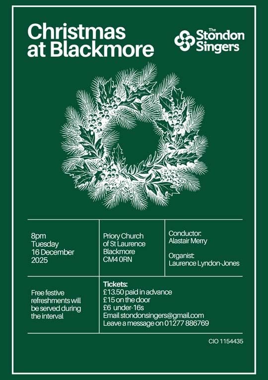 The Priory Church of St Laurence Blackmore, CM4 0RN. 8 pm Tuesday 16 December 2025.